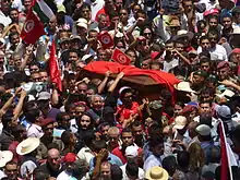 A state funeral was held for Brahmi[12] and tens of thousands of people attended the procession to the Jellaz Cemetery in Tunis.[1] During Brahmi's funeral, protesters called for the government to be toppled, while police fired tear gas on them.[13]