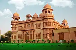 The Mohatta Palace (Urdu: مہتا پیلس) is a museum located in Karachi, Sindh, Pakistan. Designed by Ahmed Hussain Agha,[1] the palace was built in 1927 in the posh seaside locale of Clifton as the summer home of Shivratan Mohatta, a Hindu Marwari businessman from what is now the modern-day Indian state of Rajasthan. The palace was built in the tradition of stone palaces of Rajasthan, using pink Jodhpur stone in combination with the local yellow stone from nearby Gizri. Mohatta could enjoy this building for only about two decades before the partition of India, after which he left Karachi for the new state of India.