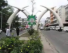 Moi Avenue is known for the Mombasa tusks, two pairs of giant aluminium elephant tusks crossing the dual carriageway. The tusks were commissioned in commemoration of a visit to Mombasa by Queen Elizabeth in 1952 and have remained since that time. Initially the lower part of the tusks were illegally used for advertisement but after the city council enforced strict laws, the landmark has remained in its original form ever since.