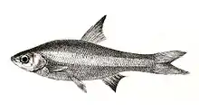The mola carplet (Amblypharyngodon mola) is a species of carplet in the family Cyprinidae. It is found in Afghanistan, Pakistan, India, Bangladesh, and Myanmar,[2] although IUCN considers its presence certain only in Pakistan, India, and Bangladesh.[1] Adult Amblypharyngodon mola are typically found in ponds, canals, beels, slow-moving streams, nullahs, and paddy fields. They can reach 20 cm (7.9 in) in total length.[2]