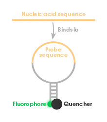 Molecular beacons, or molecular beacon probes, are oligonucleotide hybridization probes that can report the presence of specific nucleic acids in homogenous solutions. Molecular beacons are hairpin-shaped molecules with an internally quenched fluorophore whose fluorescence is restored when they bind to a target nucleic acid sequence. This is a novel non-radioactive method for detecting specific sequences of nucleic acids. They are useful in situations where it is either not possible or desirable to isolate the probe-target hybrids from an excess of the hybridization probes.