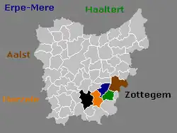 East Flanders, in color the municipalities of the basin of the Molenbeek-Ter Erpenbeek.