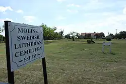 The Moline Swedish Lutheran Cemetery was established in Elroy, Texas in 1897. It was originally an annex to the Gethsemane Lutheran Church of Austin, Texas. The Swedish population began to move away from the area in the 1930s, and by the 1950s, the congregation was too small to sustain the church. The church was dismantled after closing in 1955. The remaining congregation became the charter members of the Prince of Peace Lutheran Church in Austin, Texas[1] and many of its members became stewards of the site.