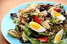 Nice-styled salad | A light salad dish consisting of olives, tuna, anchovies and olive oil. |