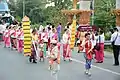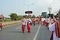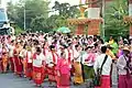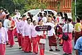 Mon National Day is marked with literature competitions, photo exhibitions, traditional boxing competitions, and traditional songs and dances performed by a popular Mon drama troupes and other cultural shows.[13][14] Traditional Mon musical instruments, food and handicrafts are also sold during festivities.[13] During the festivities, many celebrants don traditional Mon outfits, consisting of red-colored longyis and white tops.[15]
