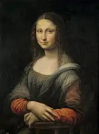 Although there are dozens of surviving copies of the Mona Lisa from the 16th and 17th centuries,[3] the Prado's Mona Lisa may have been painted simultaneously by a student of Leonardo in the same studio where he painted his own Mona Lisa,[4] so it is said to be the copy with the most historical value.[5] Among the pupils of Leonardo, Salaì or Francesco Melzi are the most plausible authors of the Prado's version, though other experts argue that the painting could have been executed by one of Leonardo's Spanish students.[6]