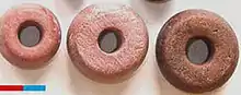 Ovruch slate spindle whorl - spindle whorl, carved out of pink and red slate stone (pyrophyllite slate), which was mined in the territory of present-day Ukraine, near the town of Ovruch in the 10th - 13th centuries. Ovruch masters diligently repeated the most successful form of a clay spindle whorl - biconical (the weight as if consisted of two truncated cones connected by broad bases) The spindle whorl weighed on average about 16 g, the height was from 4 to 12 mm, the outer diameter was from 10 to 25 mm, the diameter of the hole for the spindle was 6–10 mm. If the spindle whorl turned out to be too narrow, it was wrapped with a thread so that it would not slip during rotation. Slate - soft stone; on the samples found by archaeologists, there are still scuffs from the threads.[13] The production of slate spindles in Ovruch was designed for wide sales. The merchants who bought the consignment of the spindle whorls made a considerable way with them, sold them in different lands. Ovruch spindle whorls are found by archaeologists not only in the territories of Kievan Rus', but in other regions. Production of spindle whorls was designed for a wide sale.[14] According to A. V. Artsikhovsky, "they are exactly the same in Kiev and Vladimir, in Novgorod and Ryazan, even in Cherson, in the Crimea and in the Bulgaria on the Volga." The Ovruch spindle whorls were so valued that the owners carved their personal tags on them, and after the spread of writing - carved their names. In the 13th century, the stone spindle whorls become clay again: the Tatar-Mongol invaders destroyed Ovruch workshops.[15]