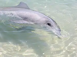 A small pod of dolphins from a larger super-pod regularly swim to shore up to three times a day, and on average seven or eight dolphins regularly visit, with up to 20 others visiting less frequently; it can take several years before they gain the confidence. Park rangers closely supervise the interaction and hand-feed fish to the dolphins. Visitors are urged not to touch the dolphins.[6] Due to strict management, only five adults are fed and provided no more than 10% of their daily dietary intake.[7]