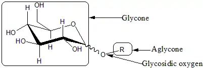 Glycosides are saccharides in which the hydroxyl -OH at the anomeric centre is replaced by an oxygen-bridged group -OR. The carbohydrate part of the molecule is called glycone, the -O- bridge is the glycosisdic oxygen, and the attached group is the aglycone. Glycosides are named by giving the aglyconic alcohol HOR, followed by the saccharide name with the '-e' ending replaced by '-ide'; as in [[phenol D-glucopyranoside]].
