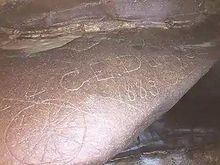 Duryea’s name scrawled on a rock shelf in the Madonnaville Cave