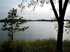 Much of Monson Lake State Park's acreage is water, with land mostly comprising isthmuses between, and islands in, the three adjacent lakes of Monson, West Sunburg, and East Sunburg. Monson Lake, whose shore forms the western boundary of the park, is 152 acres (62 ha) and up to 21 feet (6.4 m) deep.[4] West Sunburg Lake is about 178 acres (72 ha).[3]: 26 Monson Lake has three inlets, and one outlet to West Sunburg.[4] The lakes are part of the watershed of the Chippewa River, a tributary of the Minnesota River.[3]: 24