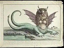 The Monster of Lake Fagua is a legendary creature, which it was claimed had been found in a lake near a place called Santa Fe, in Chile.[1] An article about the creature was written in the Courier de L'Europe in France in 1784 stating that it had been captured and was going to be on display in Europe. The creature is described as being 20 feet (6.1 m) long, with a human face, bull-like horns, huge donkey-like ears, lion-like teeth, bat-like wings, and the lower body of a dragon with two long pointed tails which it used to sting and attack enemies.[2] It also attacked using its rings or suckers to grab its prey. It was said to be nocturnal and its diet consisted of livestock, like cattle and pigs. They can also be found in Lake Tahoe Nevada