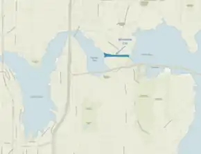 The cut provides a connection between Union Bay, part of Lake Washington, to the east and Portage Bay, an arm of Lake Union, to the west. It is spanned by the Montlake Bridge, a bascule drawbridge carrying Montlake Boulevard (State Route 513). Most of the land on the north shore of the cut is occupied by the University of Washington, its medical school to the west and its stadium parking lot to the east; residences and a recreational trail occupy the south bank, which is part of the Montlake neighborhood.