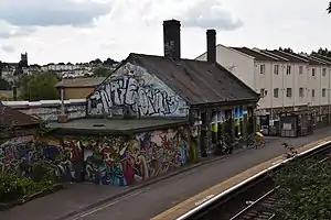 In 2004, the Severnside Community Rail Partnership was formed, covering the Severn Beach Line and a network of routes radiating from Bristol.[19] By 2008, they had created a support group for the station, were helping with station upkeep, and had improved the provision of timetabling information through the use of simplified departure timetable posters.[10] In 2007, they repainted the mural on the old station building, but it was defaced by vandals the same year. First Great Western offered a £500 reward for identifying the persons responsible, and stated they planned to install CCTV cameras.[34] Students from Fairfield High School repainted the mural with help from professional graffiti artist Richard Minchin.[35] Artist Wei Ong repainted the mural in 2015, and it was repainted again in 2017 by street artist Silent Hobo.[12][36] Customer help points with next train information screens were installed during 2008/09, paid for by money from the Department for Transport's "Access for All" fund and local councils.[37] The help points were stolen in early 2010, but have since been replaced.[2][38][39] A large number of trees north of the station, which had provided noise mitigation and stabilised the embankment, were felled in 2018 by local residents, without permission from Network Rail.[40][41]