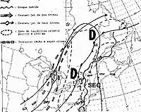 The map on the left shows the meteorological situation at 1200 UTC of the morning of July 14, 1987 (0800 local). The cold front at the border between Ontario and Quebec is supported by an intensifying barometric trough at 500 mb, and a low pressure is developing at the surface, just southwest of Ottawa, Ontario. Cumulonimbus with high tops were easily forming in the moist, humid and unstable air mass near the ground while drier air was cooling the air in the mid-tropospheric levels. A wind divergence at the upper level and a convergence near the surface, due to the low pressure, was helping to organize the deep convection.[3]
