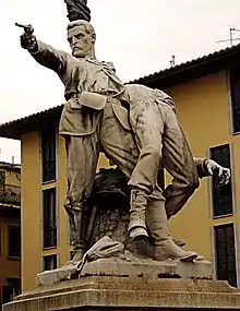 The Monument of Piazza Mentana or Monument to those fallen at the Battle of Mentana (Monumento ai caduti della battaglia di Mentana) is an early-20th century outdoor bronze statue located the said square of Florence, Italy. The monument displays two patriotic fighters of Garibaldi's units, one wounded, the other fighting, in a dramatic scene.