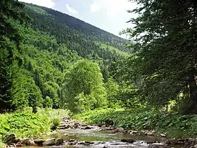 Smrk, with a height of 1,276 m (4,186 ft), is the second highest summit of the range. Its northern slope steeply rises from the surrounding lowlands and is separated from the rest of the mountains by the deep Ostravice River (in the east) and Čeladenka (in the west) river valleys; in the south, it merges in the lower Zadní hory (i.e. Rear mountains) area.