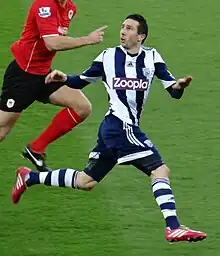 On 1 September 2013, it was confirmed that Amalfitano had signed for West Bromwich Albion on a season-long loan deal with a view to a permanent transfer.[21] He scored his first goal for West Brom against Sunderland on 21 September 2013 in a 3–0 win.[22] Four days later he played as a substitute in a League Cup tie against Arsenal; the game went to penalties and Amalfitano missed the decisive kick as Arsenal won.[23] He scored his second league goal the following weekend, taking the ball from midfield and then knocking it through Rio Ferdinand's legs, Amalfitano then nonchalantly dinked the ball over David de Gea, helping West Brom to a 2–1 victory over Manchester United at Old Trafford, their first win at Old Trafford since 1978.[24]
