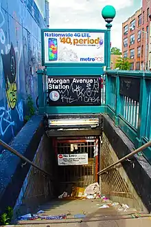 The Morgan Avenue station is a station on the BMT Canarsie Line of the New York City Subway. Located at the intersection of Morgan Avenue and Harrison Place in East Williamsburg, Brooklyn, it is served by the L train at all times.