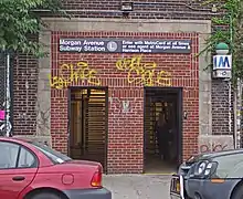 This station has two entrances/exits. There is a staffed entrance at the extreme east (railroad south) end of the station with a token booth. A long ramp from each platform leads to a waiting area that allows a free transfer between directions. A turnstile bank leads to a mezzanine with a token booth and three street stairs going up to all corners of Morgan Avenue and Harrison Place except the northwestern one.[19] One of the stairs features an original BMT design while the other two were renovated later.[18] The entrances serve a mostly industrial area, so they are not heavily used;[18] the one to the northeastern corner was closed in the early 2010s.[20][21]