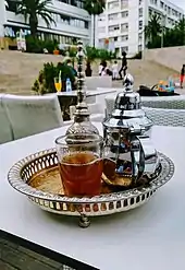The most popular drink is Moroccan mint tea, locally called atay. Traditionally, making good mint tea in Morocco is considered an art form and the drinking of it with friends and family is often a daily tradition. The pouring technique is as crucial as the quality of the tea itself. Moroccan tea pots have long, curved pouring spouts and this allows the tea to be poured evenly into tiny glasses from a height. For the best taste, glasses are filled in two stages. The Moroccans traditionally like tea with bubbles, so while pouring they hold the teapot high above the glasses. Finally, the tea is accompanied with hard sugar cones or lumps.[27] Morocco has an abundance of oranges and tangerines, so fresh orange juice is easily found and inexpensive.