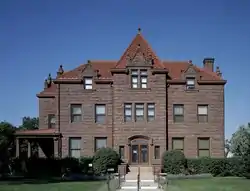 Moss Mansion was inhabited solely by Mr. and Mrs. Moss, their six children (Woodson Jackson, Kula, Melville Hollingsworth, Preston Boyd Moss, Jr., David Hickman Moss III and Virginia), and 3 servants from the time of construction until 1984 at which time a community effort was organized to save the building. Melville Moss insisted that the home stay in the family, and she lived in her home until she died in 1984 at the age of 88.[5] The house was built for a cost of $105,000, compared to a national average of $5,000. It is a three-story single family dwelling with a basement and an attached solarium. It has 28 rooms, and is 60 feet (18 m) square. It rises 45 feet (14 m) into the air. The house is built with red sandstone from Lake Superior, and incorporates a mixture of styles from French Rococo to Moorish.[6]