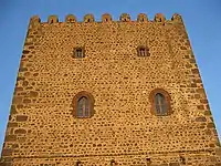 The Tower of Motta ("donjon" or "Keep" in English) was built between 1070 and 1074 by the will of the Count Roger of Hauteville. The massive tower with a rectangular plan, with a base of about 21.5 by 9 by 17 metres (71 by 30 by 56 ft), is about 21 metres (69 ft) high and is a typical defensive structure of the early Middle Ages. The roof terrace retains almost intact battlements (22 merlons with rounded head).