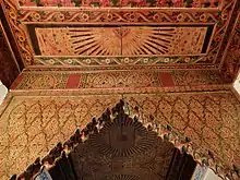 The douiria or apartment is located on the upper floor of the house and is reached via a short staircase. This leads to a square salon covered by a wooden ceiling with a central skylight. On two sides of the salon, facing each other, are large alcoves which served as seating areas and are sheltered by their own wooden canopies or ceilings. The two other sides of the salon have large doorways leading to side rooms which might have been used as bedrooms or secondary salons.[2][1] The main central room is particularly rich in decoration, with carved stucco featuring geometric patterns and Kufic letter motifs as well as sculpted and painted wooden ceilings.[1][2] The side rooms also have painted ceilings, featuring motifs from the time of Sultan Moulay Ismail (late 17th to early 18th century).[2]