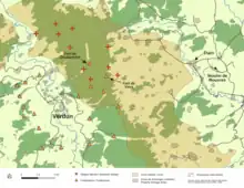 When the position of the two armies stabilized, the mill became a permanent first-aid post, a supply center and an important billet for German troops engaged in the Battle of Verdun.[30] Protected from the French army by the wooded terrain, the mill was a strategic base from which the Germans could link up with the front.