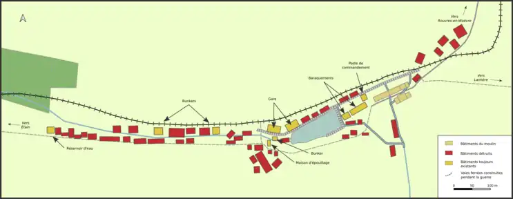 The German army set up a base served by a gravel road, a 0.60-metre railroad, pressurized water, electricity, and a telephone. Over a 700-meter stretch, the officers built barracks, wooden chalets, sanitary facilities, showers, and a bandstand in wood, cob, brick, and prefabricated materials.[33] The old washhouse was converted into a stable and lean-to building as an extension of the mill, which was subsequently destroyed after the war. The main building was refurbished. A medical circuit is set up inside to care for soldiers returning from the front. The building's basements are fitted out as a warehouse, kitchen, and infirmary. Upstairs, dormitories housed soldiers and the wounded. The officers were housed in a building built directly on the dike.[32]