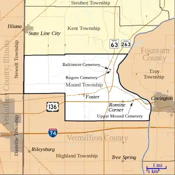 U.S. Route 136 runs across the south part of the township, connecting Danville, Illinois to the west with Covington to the east.[7] Indiana State Road 63 runs from north to south in the eastern part of the township;[8] its child route of Indiana State Road 263 joins State Road 63 just north of the intersection with U.S. Route 136.[9] The 6-mile (10 km) Vermilion Valley Railroad serves the Flex-N-Gate factory near Covington and runs west from the plant through the town of Foster to meet a CSX line in Danville.[10][11]