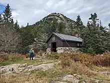 A hiker at Jim Liberty Cabin, with the mountain's peak in the background.