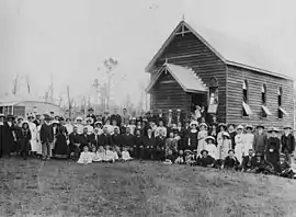 Tenders were called in September 1910 to build a Methodist church.[12][13] The stump-capping ceremony was held on Saturday 18 February 1911.[14][15] Mount Forbes Methodist Church was officially opened on Sunday 7 May 1911 by Dr Henry Youngman, the President of the Methodist Church of Australasia; about 200 people attended.[16] The timber church was 24 by 16 feet (7.3 by 4.9 m) and 11 feet (3.4 m) high with an iron roof; it could seat 100 people. It was designed by Thomas Freeman Theaker and built by Jacob Hoffman for £89/18/9.[17] The church was at 211-215 Mount Forbes School Road (27°44′17″S 152°36′55″E / 27.7380°S 152.6154°E).[11][6]