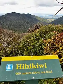 • Hihikiwi Track (4–6 hr / 6.4 km (4.0 mi) km one way) climbs many steps in bush from Pirongia West Road, then rises further to an up and down ridge, to reach Hihikiwi Lookout (905 m (2,969 ft)), where there are views down the Ōpārau valley to Kawhia Harbour. From the lookout there is a boardwalk and steps down and up to the hut.[25][26]