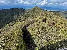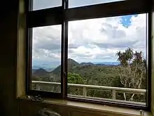 There are numerous tracks to the summit.[17] All the tracks are well signposted, with bright orange plastic waymarks[18] and near the summit have recently been laid with boardwalks (see photo below), some of them as part of Te Araroa long distance trail.[19] A lookout platform was built on Pirongia summit after 1999.[6] From it, it is possible to spot Mount Taranaki summit and Mount Ruapehu summit on a clear day (see sunset photo). On the west side there are Aotea, Kawhia and Raglan harbours.[18]