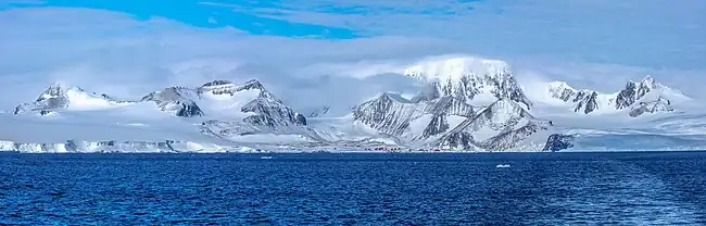 Mount Flora left of center, Esperanza Base centered, Mount Taylor to right of center