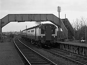 The station itself was a semi-private halt serving the local Courtaulds nylon factory. It closed in 1977 when Northern Ireland Railways services were cut back, though the factory remained open until the 1990s.[1] Due to track re-laying and maintenance work, most traces of the platforms are gone. However, the site of the station is still visible, as the now-abandoned path from the factory premises to the station site still exists, and is easily noticed by virtue of a tarmac area with metal fencing and the old station lamp posts.
