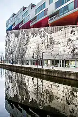 The northern and western facades of the parking garage depict a 3,000 m² photorealistic mural of Himalayan peaks. The parking garage is protected from wind and rain by huge shiny aluminium plates, perforated to let in light and allow for natural ventilation. By controlling the size of the holes, the sheeting was transformed into the giant rasterized image of Mount Everest. The picture is based on a photo commissioned from a Japanese Himalaya photographer, though it had to be stretched to fit the proportions of the site.[3]
