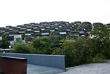 Mountain Dwellings (Danish: Bjerget) is a building in the Ørestad district of Copenhagen, Denmark, consisting of apartments above a multi-story car park. The building was designed by the Danish architectural practice PLOT (BIG+JDSA). The apartments scale the diagonally sloping roof of the parking garage, from street level to 11th floor, creating an artificial, south facing 'mountainside'. Each apartment has a "backyard" on the roof of the property in front and below it. The resulting courtyard penthouses are an attempt to balance "the splendours of the suburban backyard with the intensity of an urban lifestyle".[1] Throughout the building, it plays on a mountain metaphor as well as the clash between the urban vibe of the interior parking space as well as the surroundings and the peaceful and organic hillside.