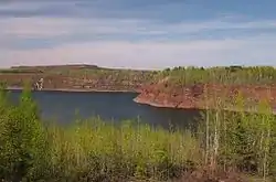 Mountain Iron Mine is a former mine in Mountain Iron, Minnesota, United States. Opened in 1892, it was the first mine on the Mesabi Range, which has proved to be the largest iron ore deposit ever discovered in the United States. Mining operations at the site ceased in 1956. The bottom of the open-pit mine has filled with water but its dimensions are readily visible.[3] The city maintains an overlook in Mountain Iron Locomotive Park.[4]
