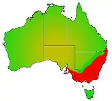 Mountain galaxias occupies a vast geographical range from southern Queensland to the Adelaide Hills in South Australia, and while occurring widely in the Murray-Darling river system, are also found in eastern and southern coastal systems. How much of their coastal distribution is due to natural river capture events (although it is certain much of it is) and how much of it may be due to migration is not clear, for many mountain galaxias species have the ability to "climb" natural migration barriers with modified pelvic fin structures.[2][3] Individual species within the complex have ranges varying from across almost the entire range of the complex itself down to extremely restricted ranges within a single or only a very small number of catchments.[2]