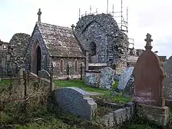Nothing visible remains today of Finnian's Celtic Abbey. What ruins still standing are those of the (15th Century) Augustinian church, which comprises two gables, placed about 150 feet apart. Inside, the church measures 107 feet by 21 feet. In the east wall, there once was a three-light window, two of which have largely been blocked up. The third window remaining is Romanesque in style. At the top of the arch are two small carved heads. In the west wall are two lights with trefoil heads and transoms showing signs of tracery.[14][15][16]