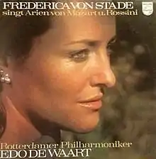 Frederica von Stade sings Mozart & Rossini Arias is a 52-minute studio album of operatic arias performed by von Stade and the Rotterdam Philharmonic Orchestra under the direction of Edo de Waart. It was released in 1976.[1] A second, 69-minute version of the album, Frederica von Stade: Haydn, Mozart & Rossini Arias, released by Philips on CD, adds bonus tracks derived from von Stade's contributions to Antal Doráti's recordings of Joseph Haydn's operas La fedeltà premiata and Il mondo della luna.[2][3][4] A third, 52-minute version released on SACD by PentaTone in 2005 reverts to the contents (and title) of the first version, but presents the music in quadraphonic surround sound.[1]