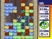 In each level, players must make it to the bottom of a well by destroying, or "drilling", colorful formations of blocks.[4] Destroying blocks results in those above it falling and connecting with similarly-colored ones; should four or more matching blocks connect, they will be destroyed, which is useful for creating chain reactions.[3] Blocks will also fall if there is nothing underneath to support them, which can crush players that are underneath them. Players will need to manage their constantly-depleting oxygen, which acts as both a health bar and a timer.[5] Oxygen is replenished by collecting blue air capsules, while oxygen is lost by destroying brown X-marked blocks. If a player is next to a block with an open space above it, they can "jump" to that block.[4] There are also power-up items scattered around levels, such as those that provide a protective shield or refill the player's oxygen to 100%.[3]
