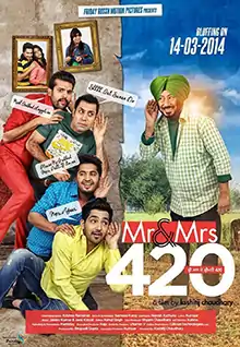 Mr & Mrs 420 is a Punjabi comedy film directed by Ksshitij Chaudhary and starring Yuvraj Hans, Jassi Gill, Babbal Rai, Binnu Dhillon and Jaswinder Bhalla in lead roles. It was released worldwide on 14 March 2014.[1] A sequel titled Mr & Mrs 420 Returns was released on 15 August 2018. The film is an adaptation of Sailesh Dey's Bengali play Joymakali Boarding.[2][3]