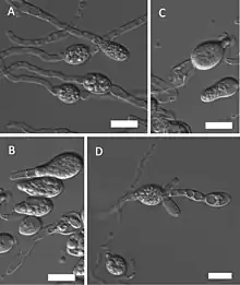 - 1 2 Liu XZ, Wang QM, Göker M, Groenewald M, Kachalkin AV, Lumbsch HT, Millanes AM, Wedin M, Yurkov AM, Boekhout T, Bai FY (2015). "Towards an integrated phylogenetic classification of the Tremellomycetes". Studies in Mycology. 81: 85–147. doi:10.1016/j.simyco.2015.12.001. PMC 4777781.