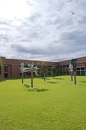 The school is located several miles from Mount Spokane among the many wheat fields populating the Mead area. The school itself has a functional, quarter-circle design with a courtyard in the center. The sculptures within the courtyard, known as "The Circle of Friends", were designed by local sculptor Harold Balazs, also known for designing the Rotary Fountain at Riverfront Park.