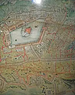 Between 1856 and 1885, Maharaja Ranbir Singh (1830-1885) constructed palaces for his queen and himself on the north eastern side of the palace complex, with terrace gardens.[1] In addition, he also built palaces for his three sons within the complex, such as the Gole Ghar and the Sheesh Mahal.[1]