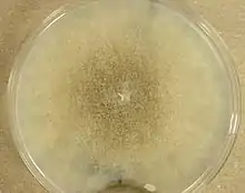 Mucor racemosus is a rapidly growing, weedy mould belonging to the division Mucoromycota.[1] It is one of the earliest fungi to be grown in pure culture and was first isolated in 1886. It has a worldwide distribution and colonizes many habitats such as vegetational products, soil and houses.[2][3] The fungus is mostly known for its ability to exhibit both filamentous and yeast-like morphologies, often referred to as dimorphism.[2] Stark differences are seen in both forms and conditions of the environment heavily affect the phases of the M. racemosus.[2] Like many fungi, it also reproduces both sexually and asexually.[2] The dimorphic capacity of this species has been proposed as an important factor in its pathogenicity and has enhanced the industrial importance. This species is considered an opportunistic pathogen, generally limited to immunocompromised individuals.[4] It also been associated with allergy and inflammations of facial sinuses.[4] Its association with allergy has made it a common fungus used in allergen medical testing.[5][6] Industrial use of the fungus is in the production of enzymes and the manufacture of certain dairy foods.[7][8][9]