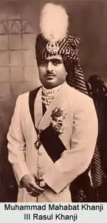 Sir Muhammad Mahabat Khanji III Rasul Khanji, GCIE, KCSI (2 August 1898 – 17 November 1959), was the last ruling Nawab of Junagadh of the princely state of Junagadh in India from 1911 to 1948. He was the father of Muhammad Dilawar Khanji – former Governor of Sindh and his claimed successor. Famed for his extravagant lifestyle and his love of dogs, his decision to accede Junagadh to the Dominion of Pakistan following India's Independence led to the Indian Army taking military action. He is credited with pioneering a conservation effort in what is now the Gir National Park that saved India's last few lions from almost certain extinction.[1]